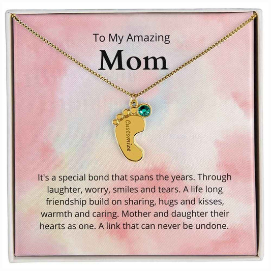To My Amazing Mom It's a special bond that spans the years Custom Baby Feet Necklace with Birthstone